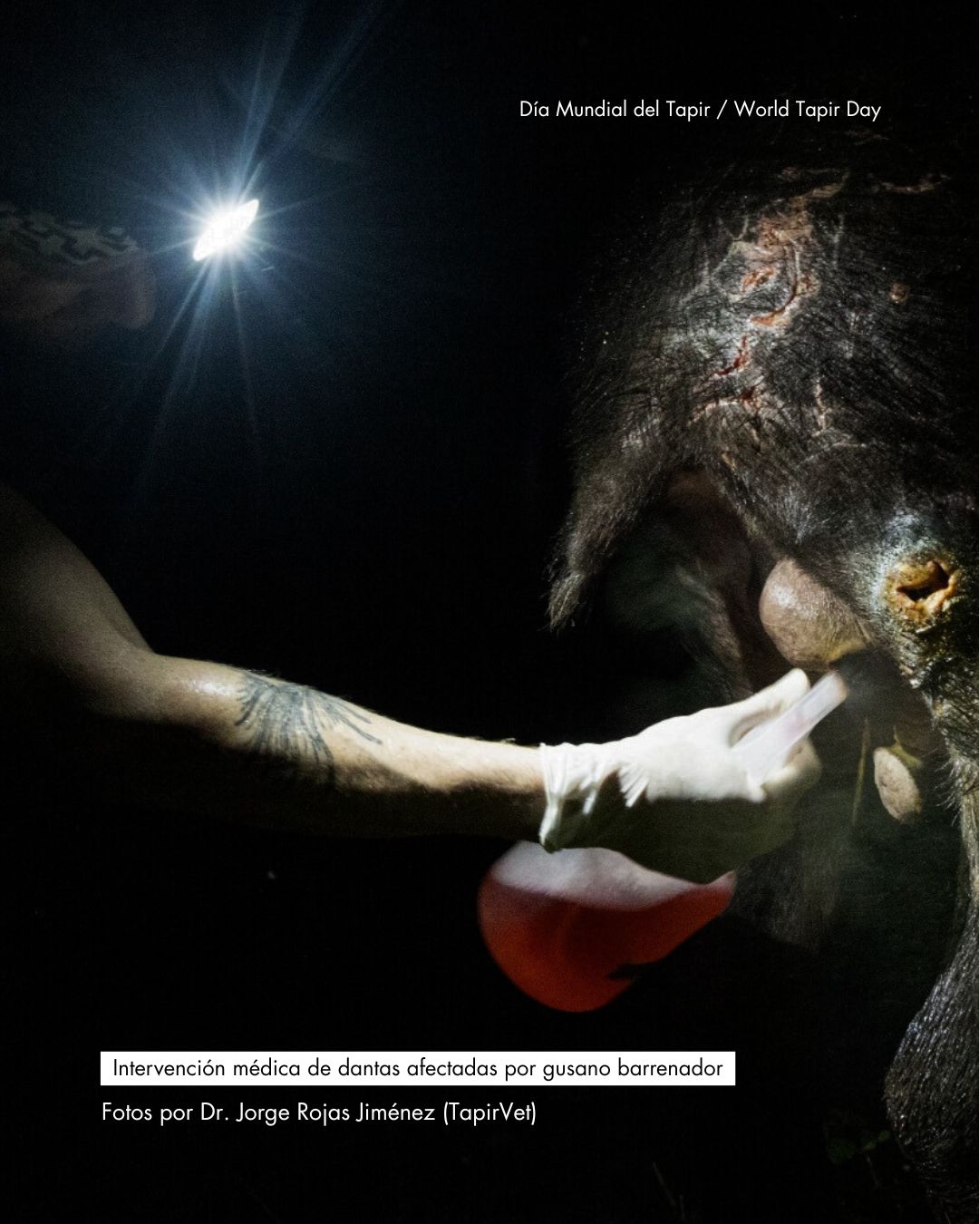 Imágenes sobre la intervención médica de dantas afectadas por gusano barrenador, cortesía del Dr. Jorge Rojas Jiménez, director del Proyecto Tapir Vet